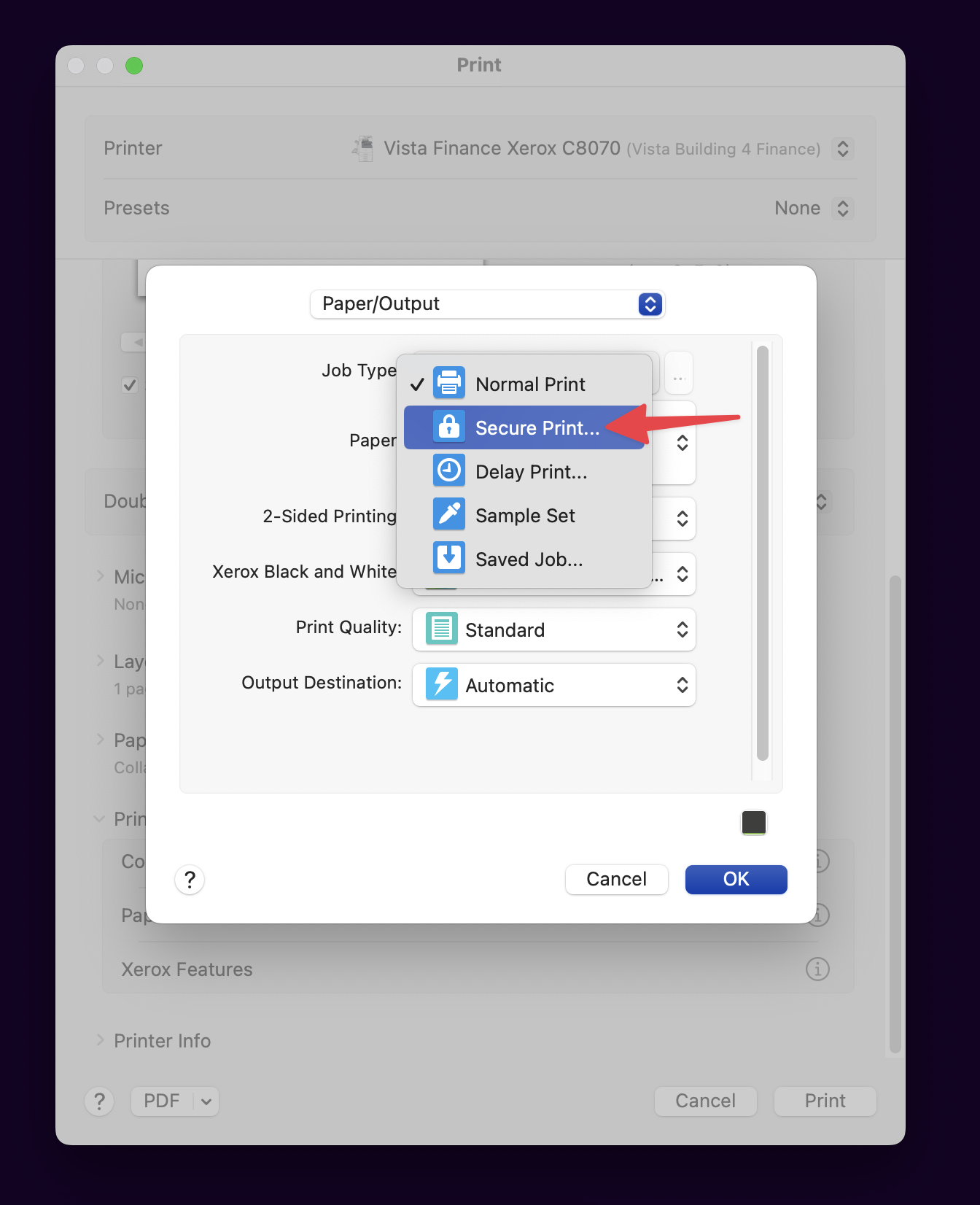 In the "Job Type" field, choose the Secure Print option and enter a code when prompted.Step 3. Collect Your Secure Print Job at the Xerox Machine