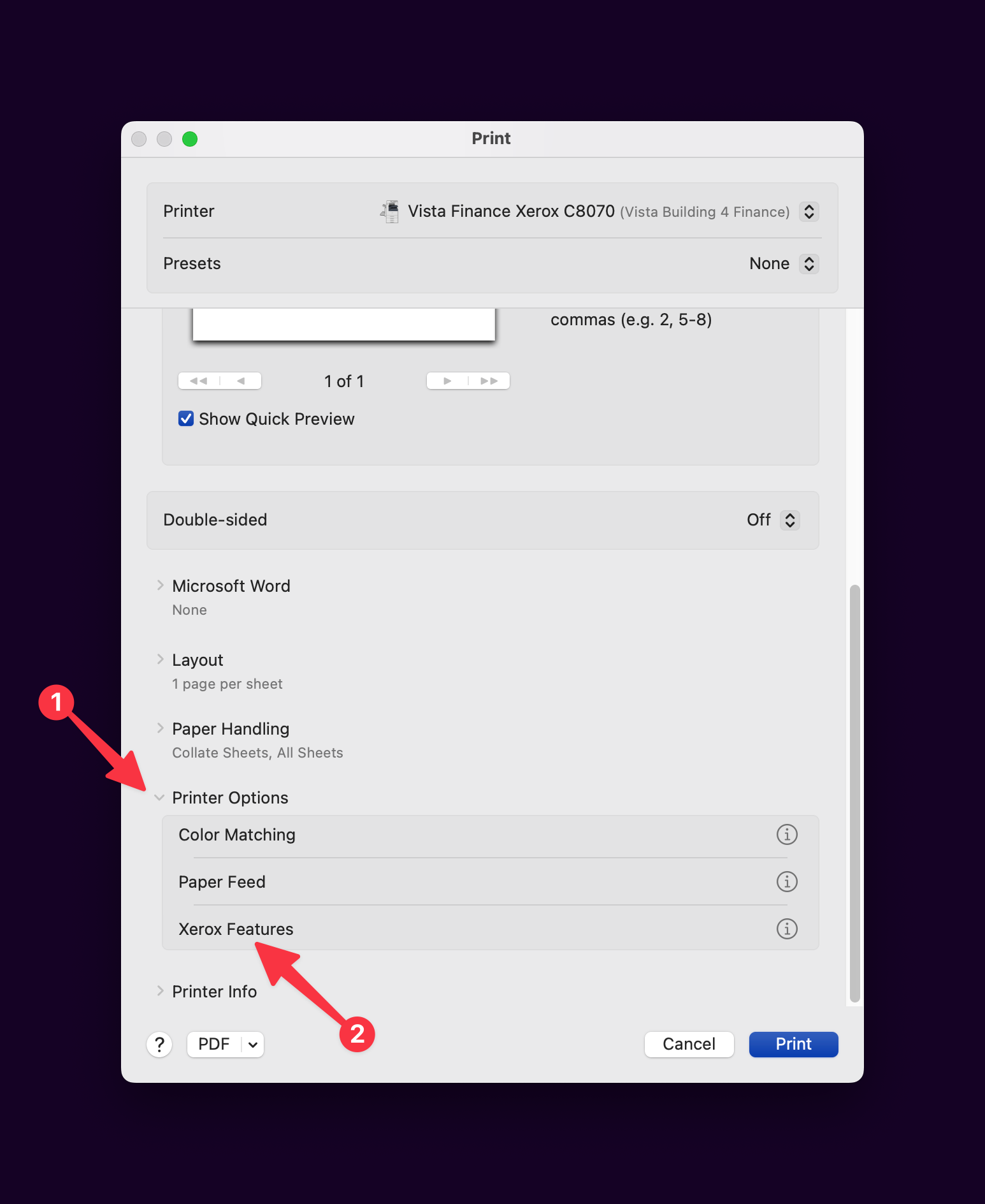 Scroll down in the print dialogue, select Printer Options, then select Xerox Features.