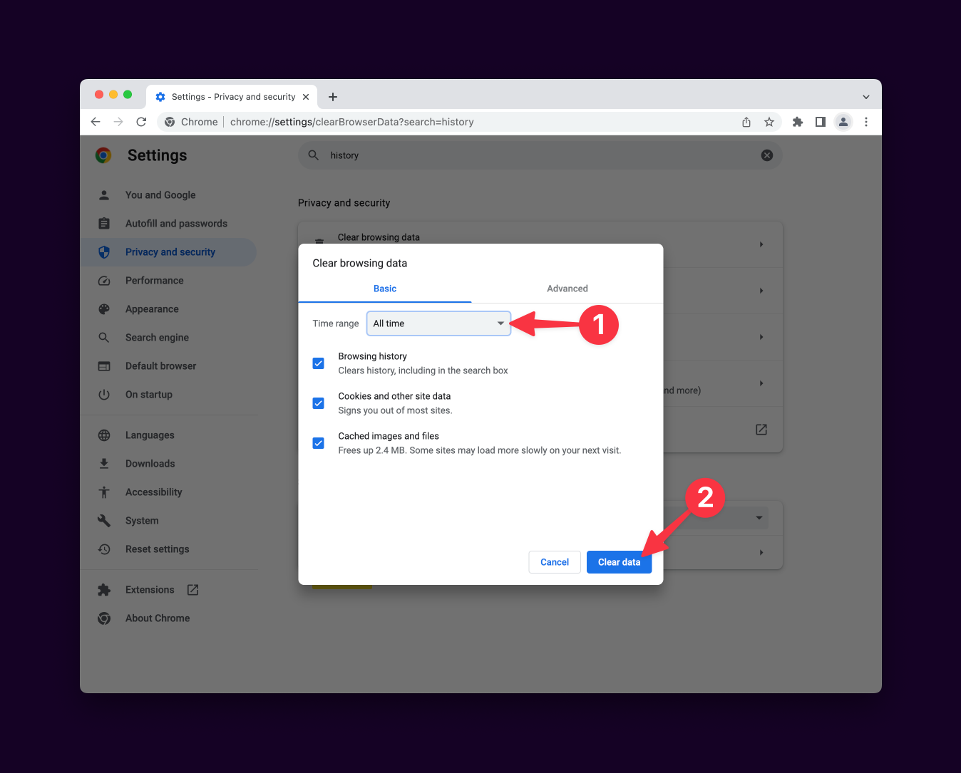 - Select "All Time" from the drop-down of options. Then select "Clear Data."