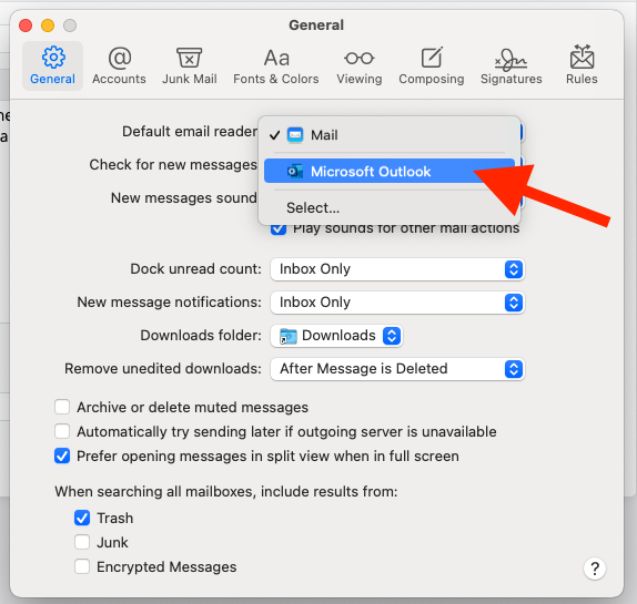 3. Select the option to choose the default mail reader and select Outlook.