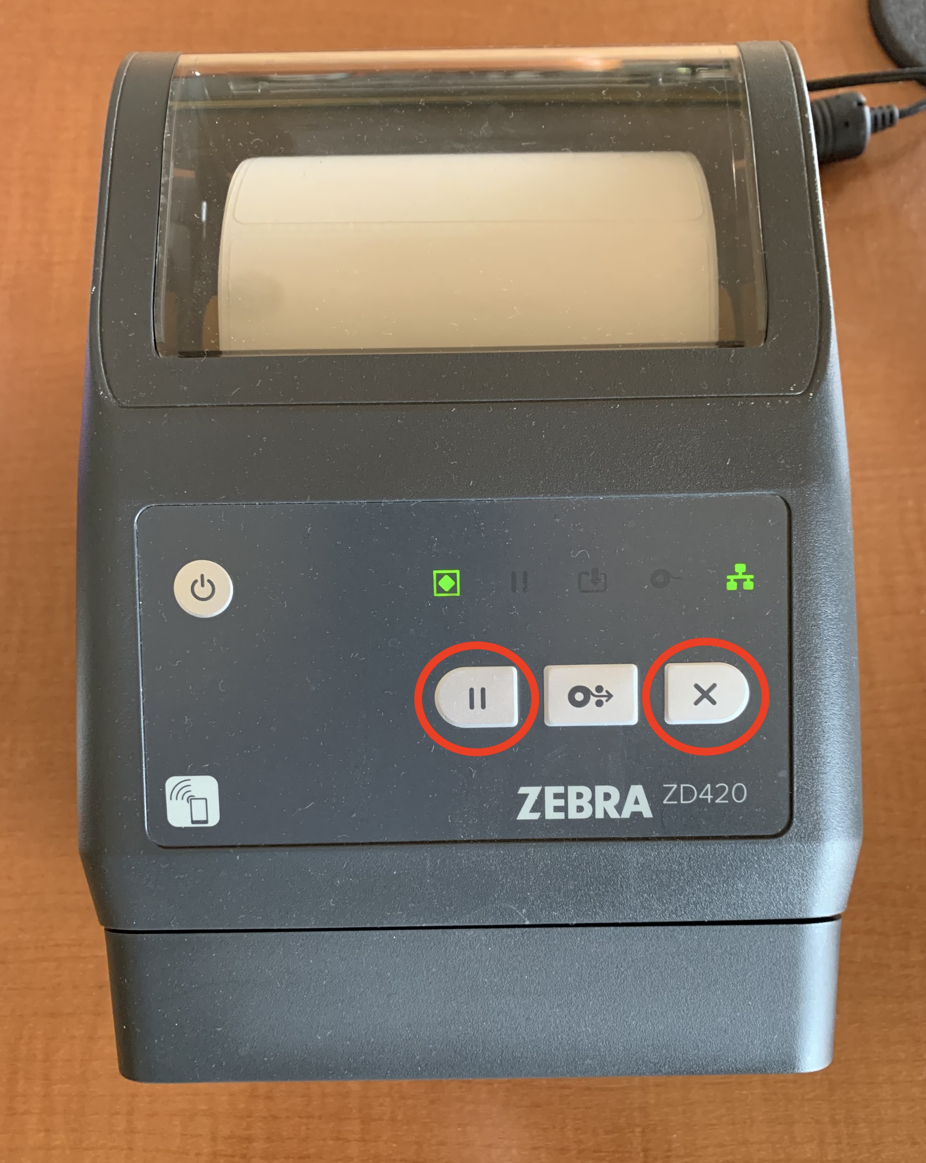 In order to recalibrate the printer, press and hold the pause button (left) and the cancel button (right) for about five seconds.