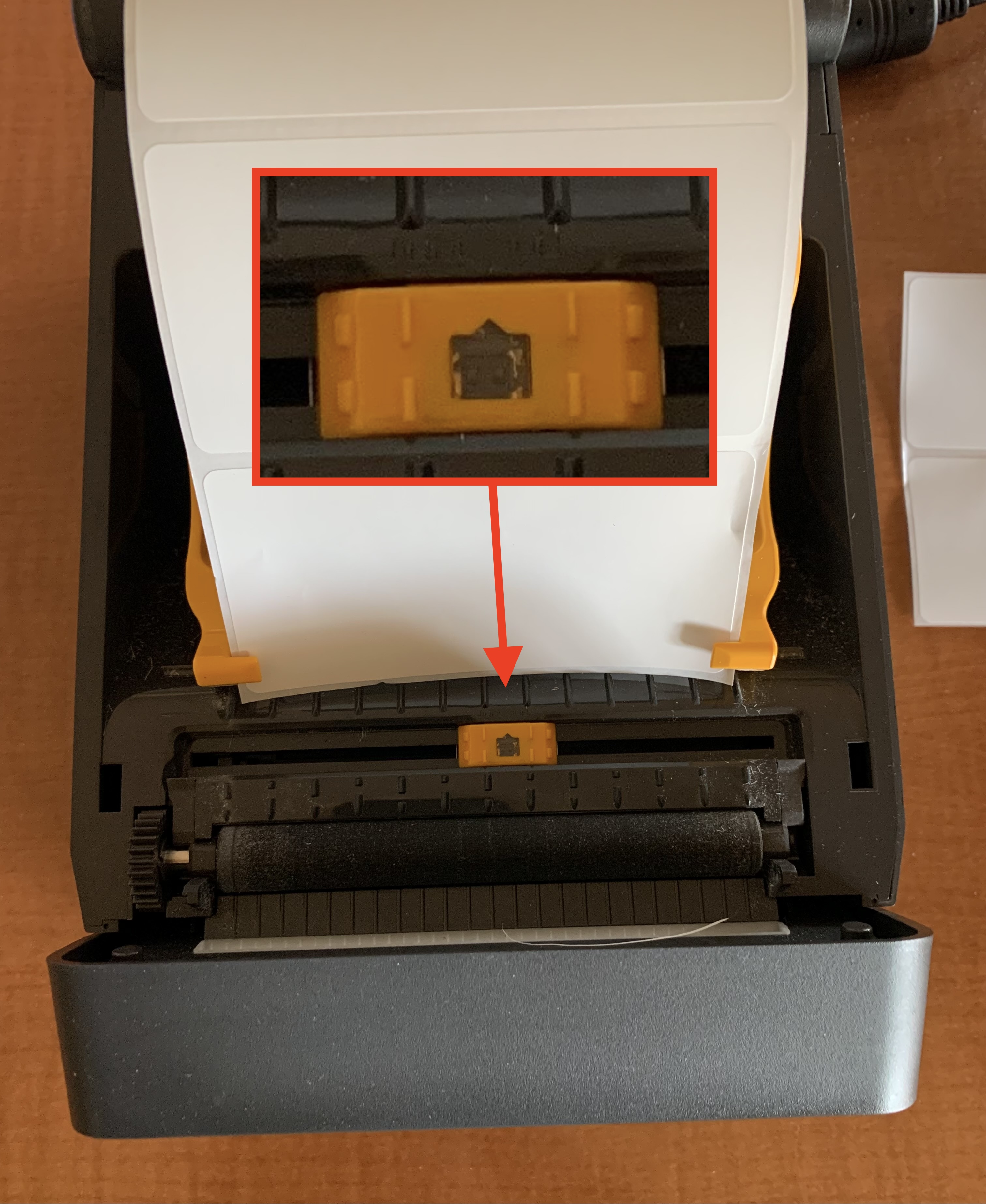Open the printer with the yellow latches on either side of the printer, and roll the tags back so that the yellow sliding sensor is visible.