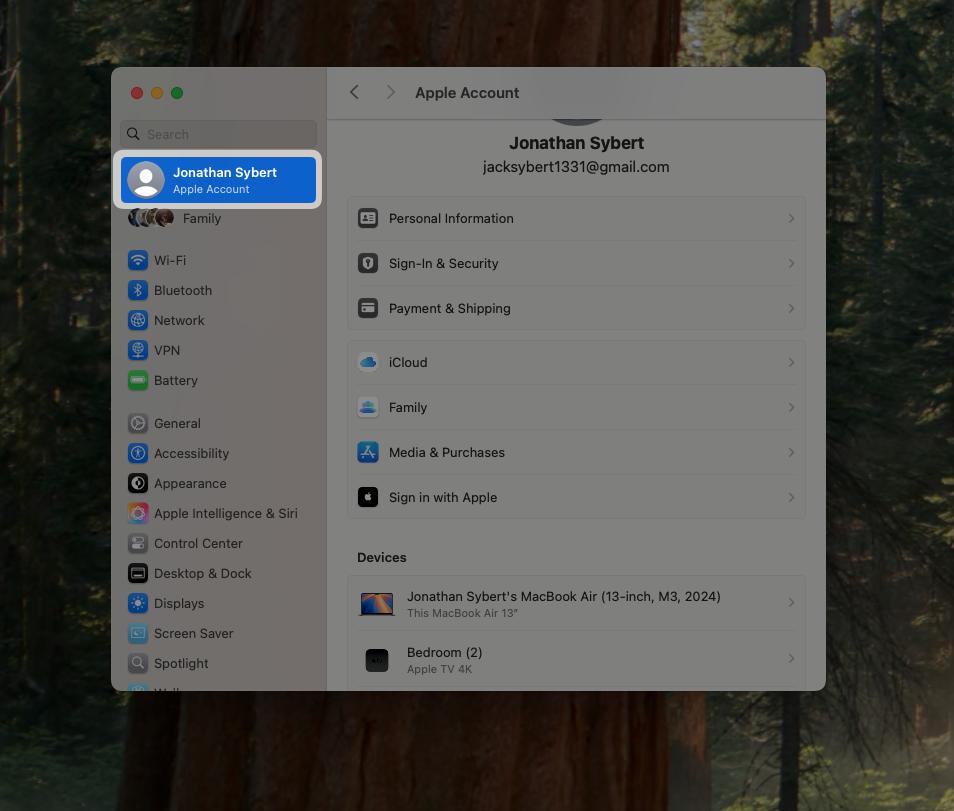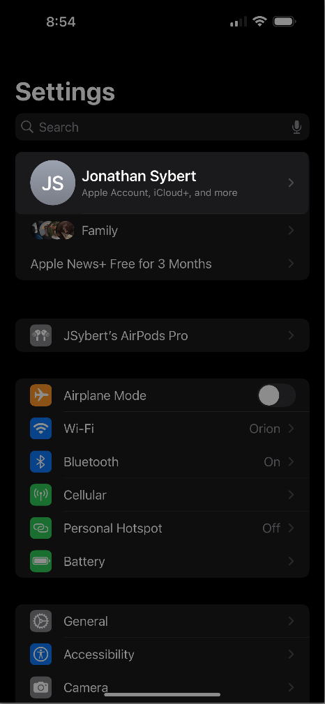 Similar to the steps from before. Go to the Settings App, and Click on the Apple Account tab at the top.