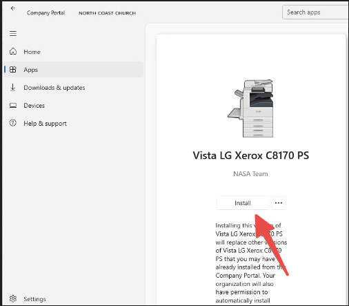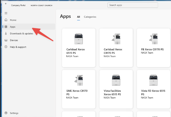 Step 2: Select Apps on left hand side and find the printer you would like to install