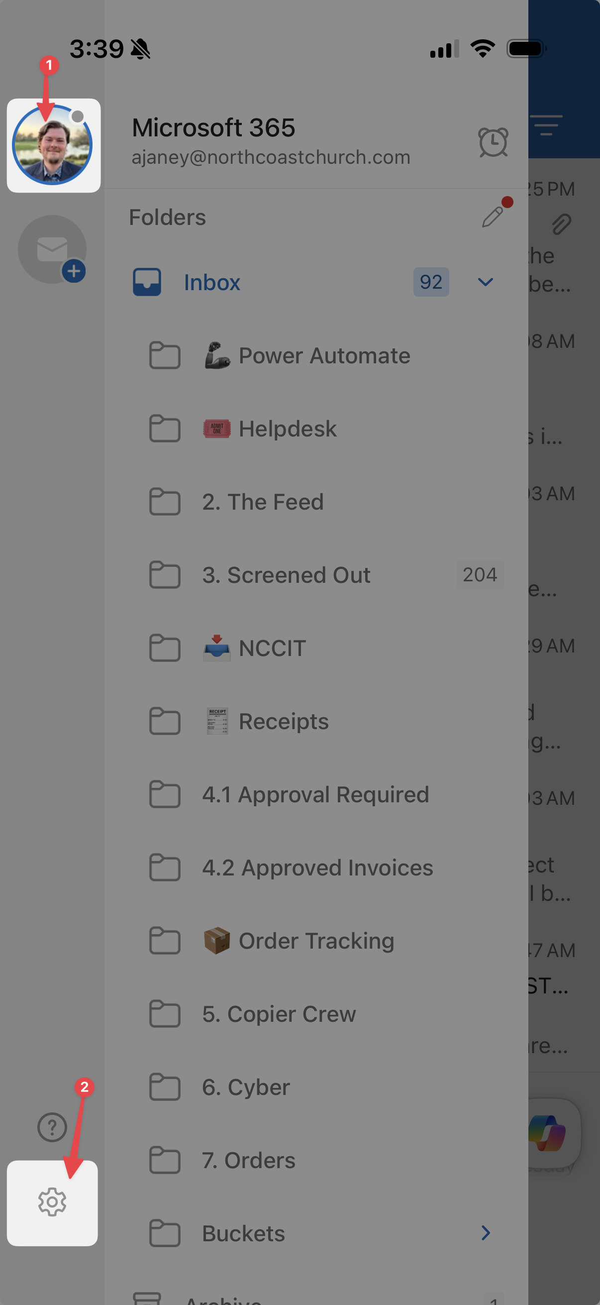 To disable Focus and Other on iPhone and iPad, first open Outlook, then tap your icon and open the settings menu