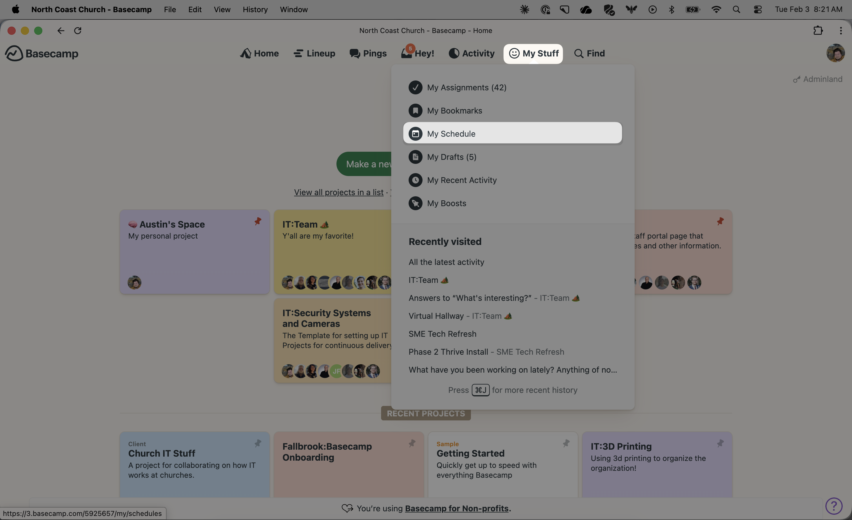 IT recommends everyone using Basecamp add their schedule to their Outlook - and then separately add individual projects they are responsible for.