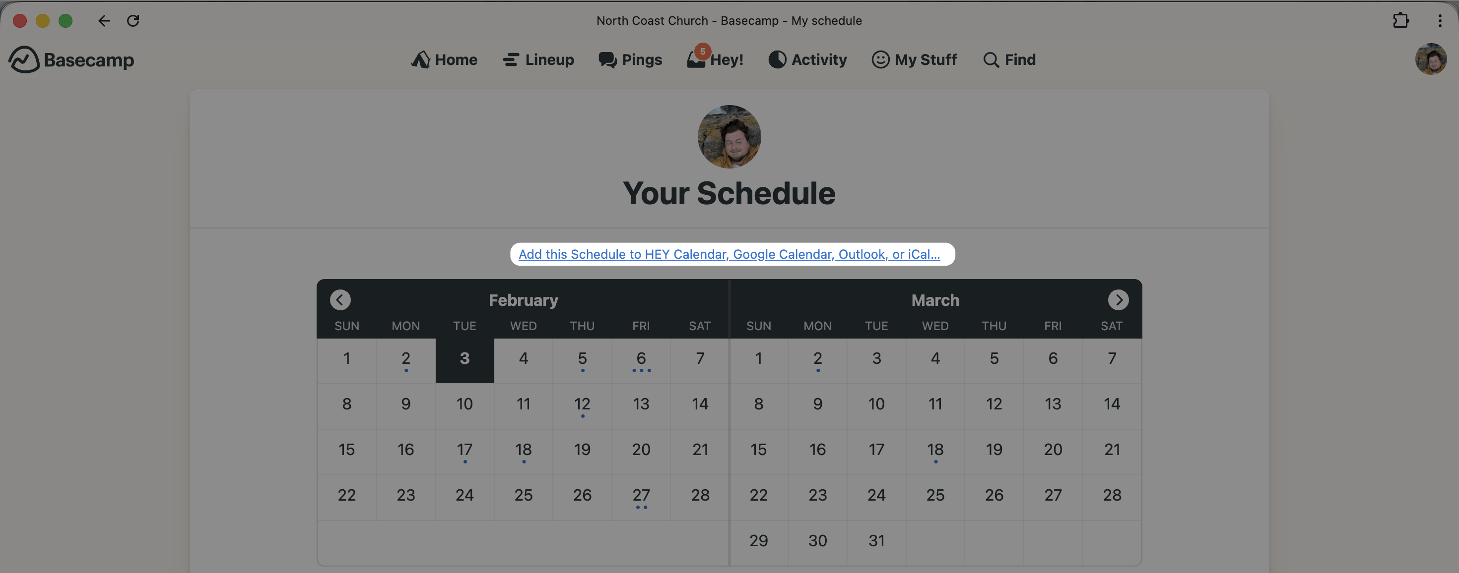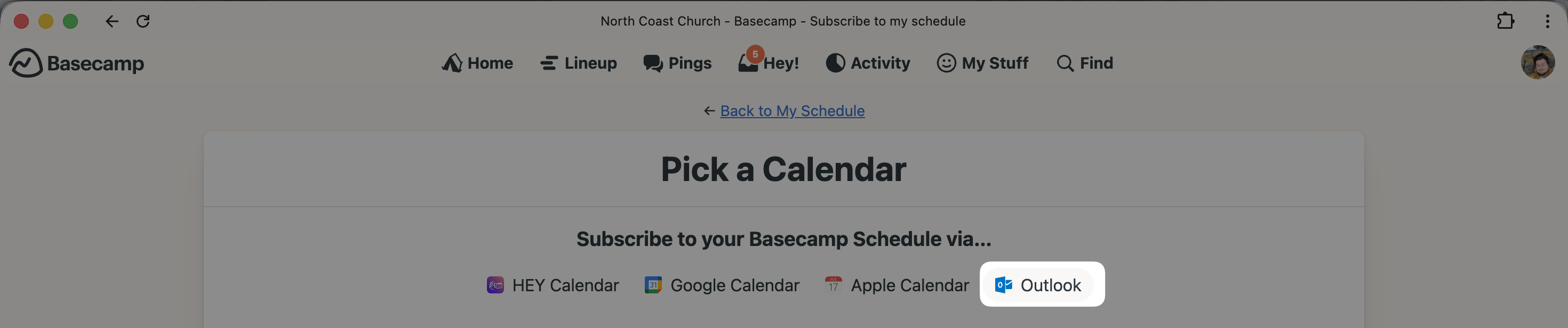 Within Basecamp, each person has a schedule that will populate all tasks and events assigned to them. To have your Basecamp assignments appear on your Outlook Calendar, follow the steps below: