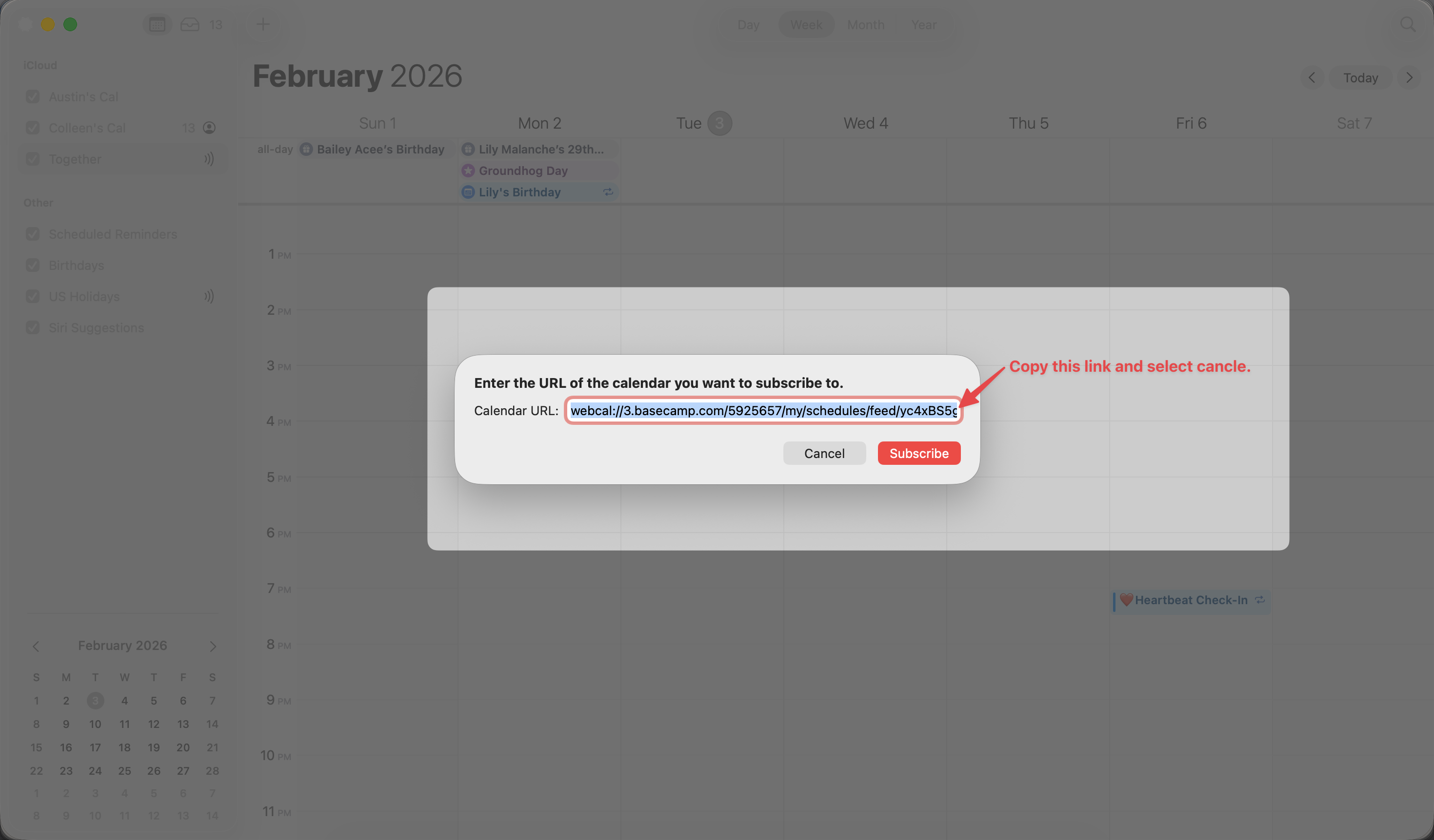 Copy the Basecamp link (you can cancel and close the calendar app.)