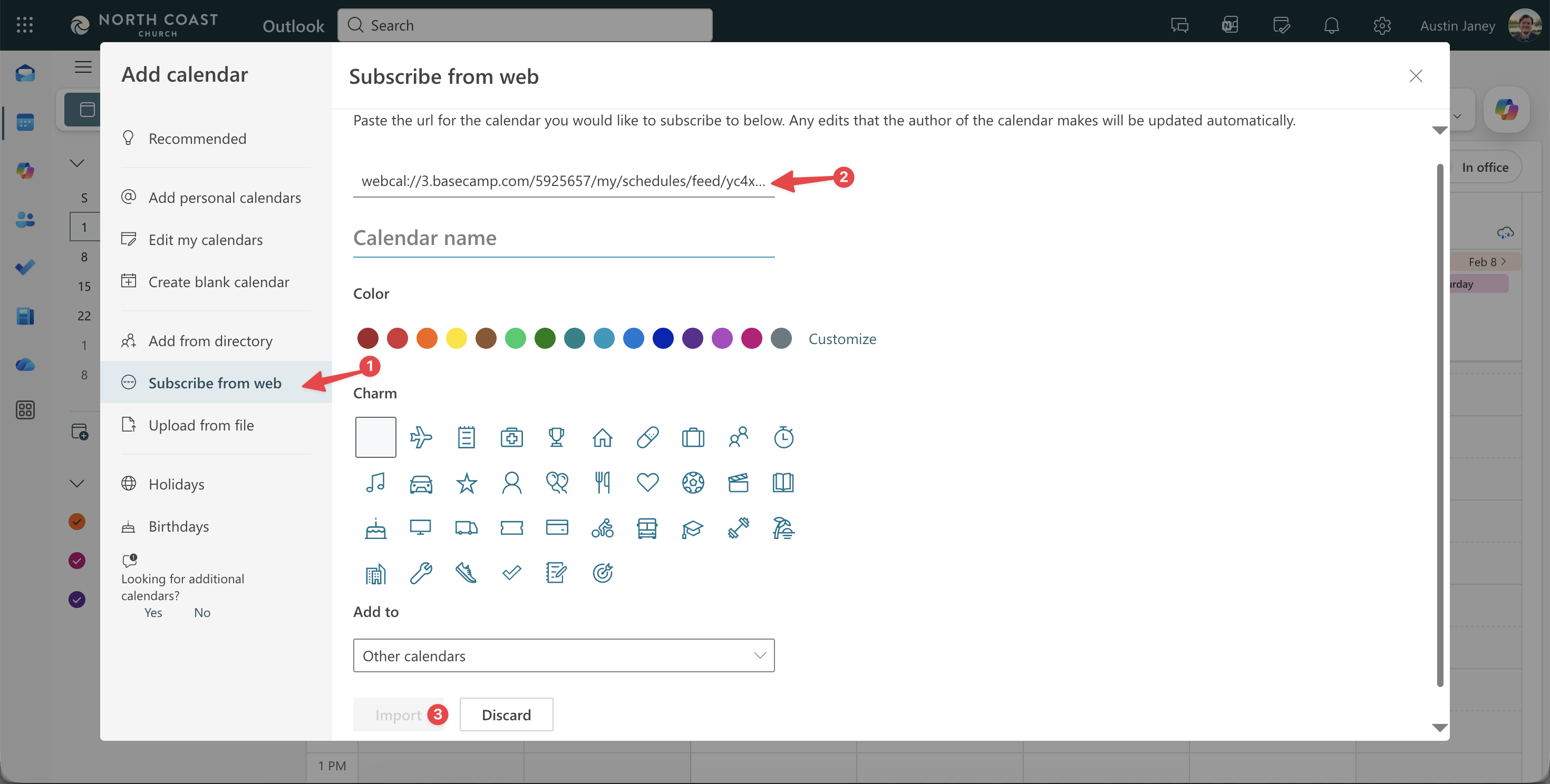 Next head over to outlook on the web to add this calendar, direct link: https://outlook.cloud.microsoft/calendar/addcalendar - Then select "Subscribe from web" and paste the calendar link and fill out additional details like calendar name, color, and icon. Once done click import: