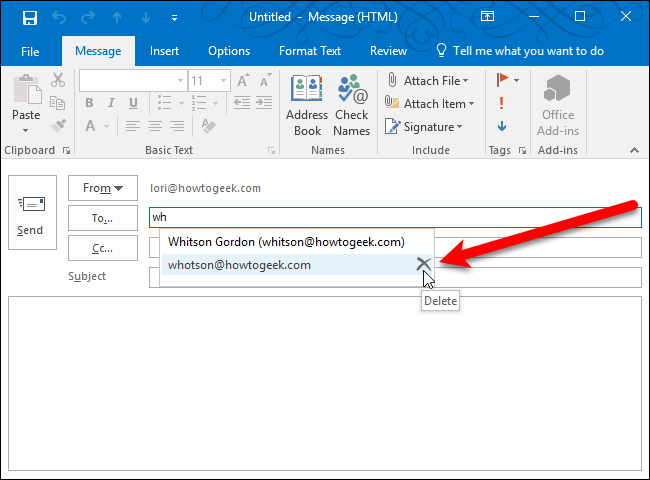 To remove a cached address, begin to type the address into Outlook and select the grey or red X next to the automatically populated email address as pictured below: